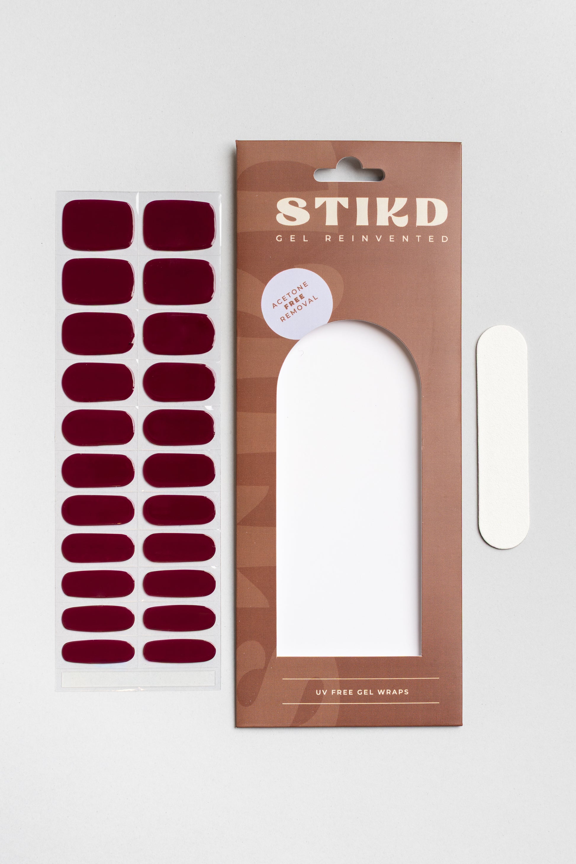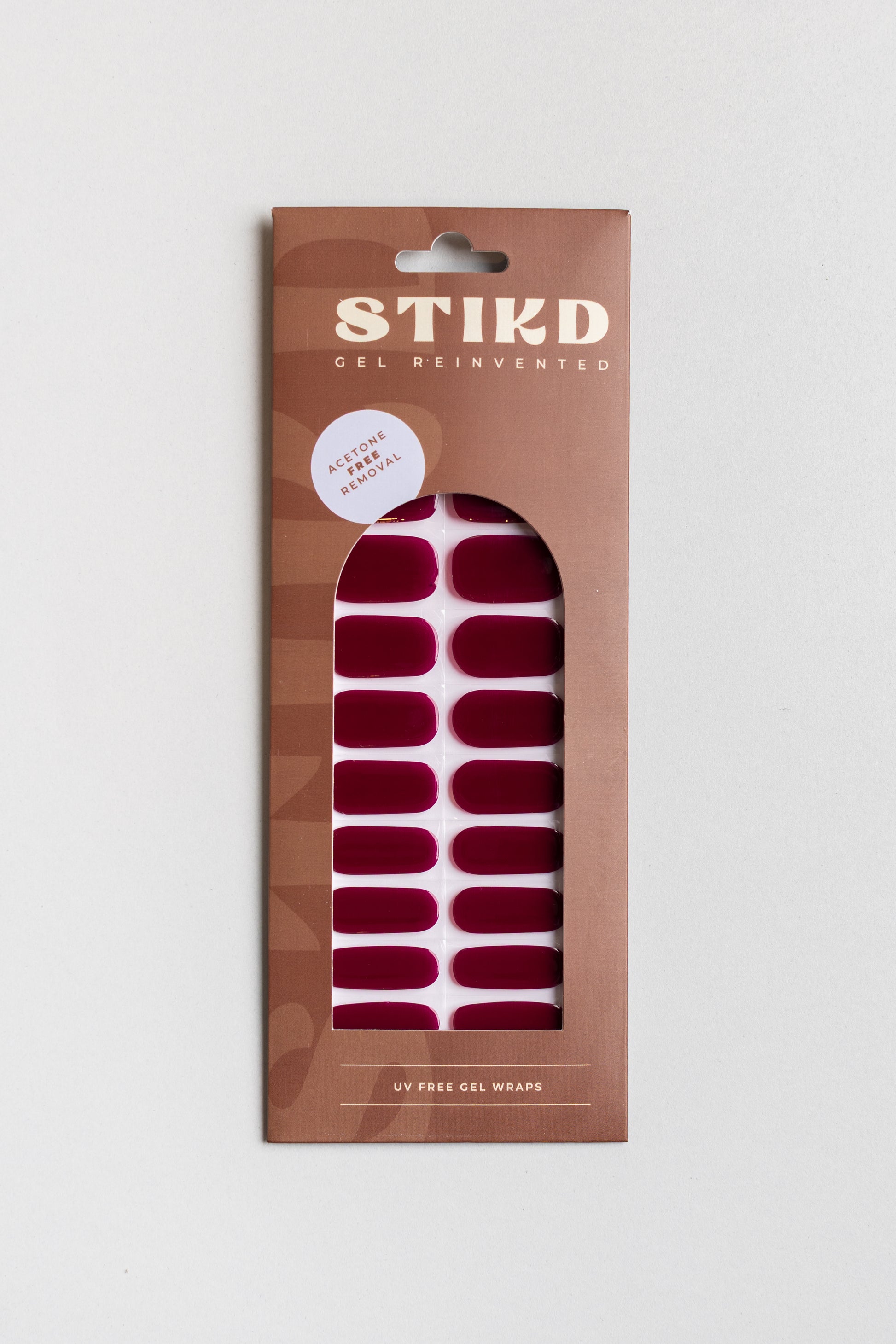 A dark plum set of fully cured gel nails. 22 sizes to choose from. Optional, but recommended: finish off with STIKD Glow On! Quick Air-dry top coat.