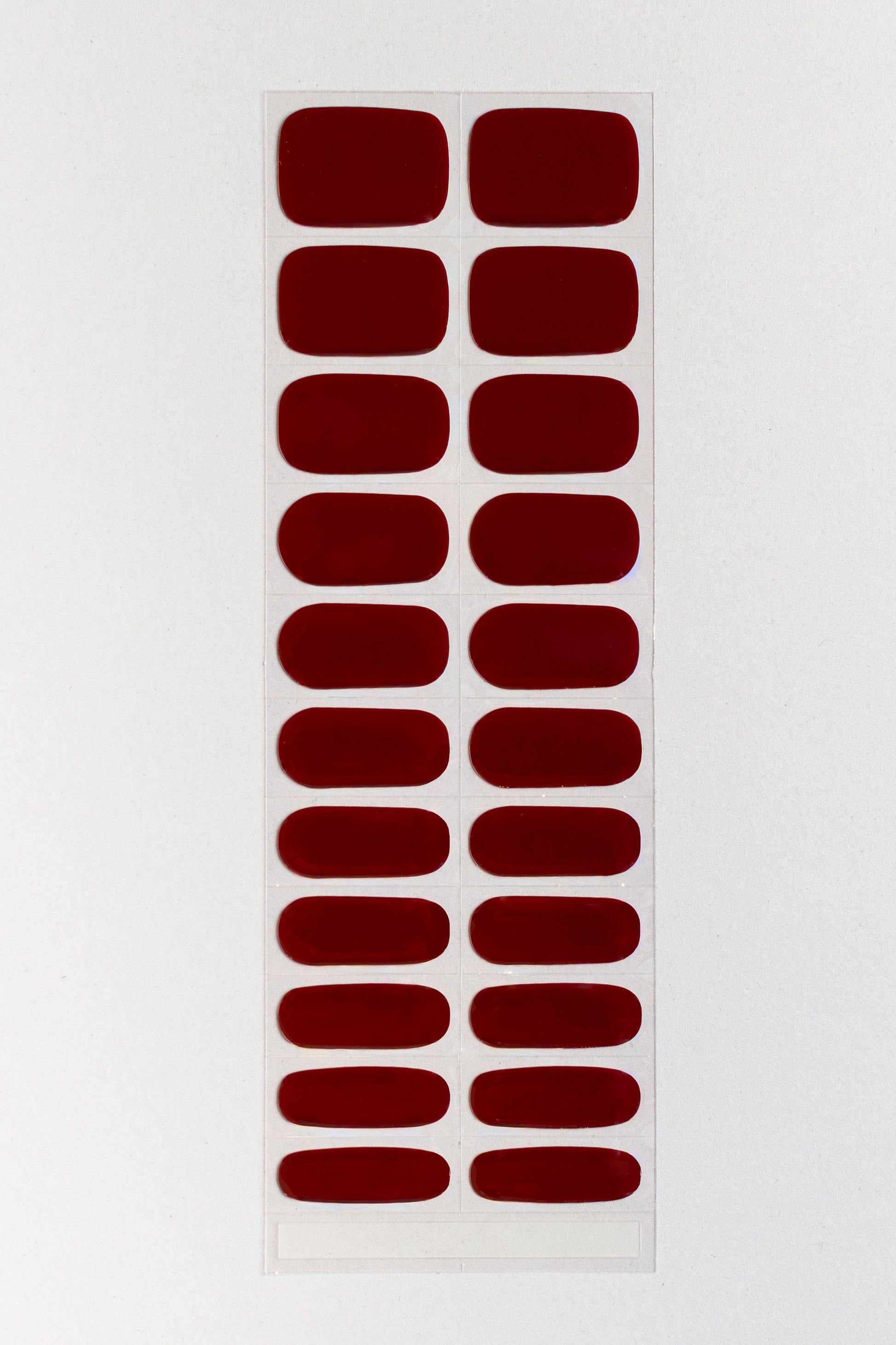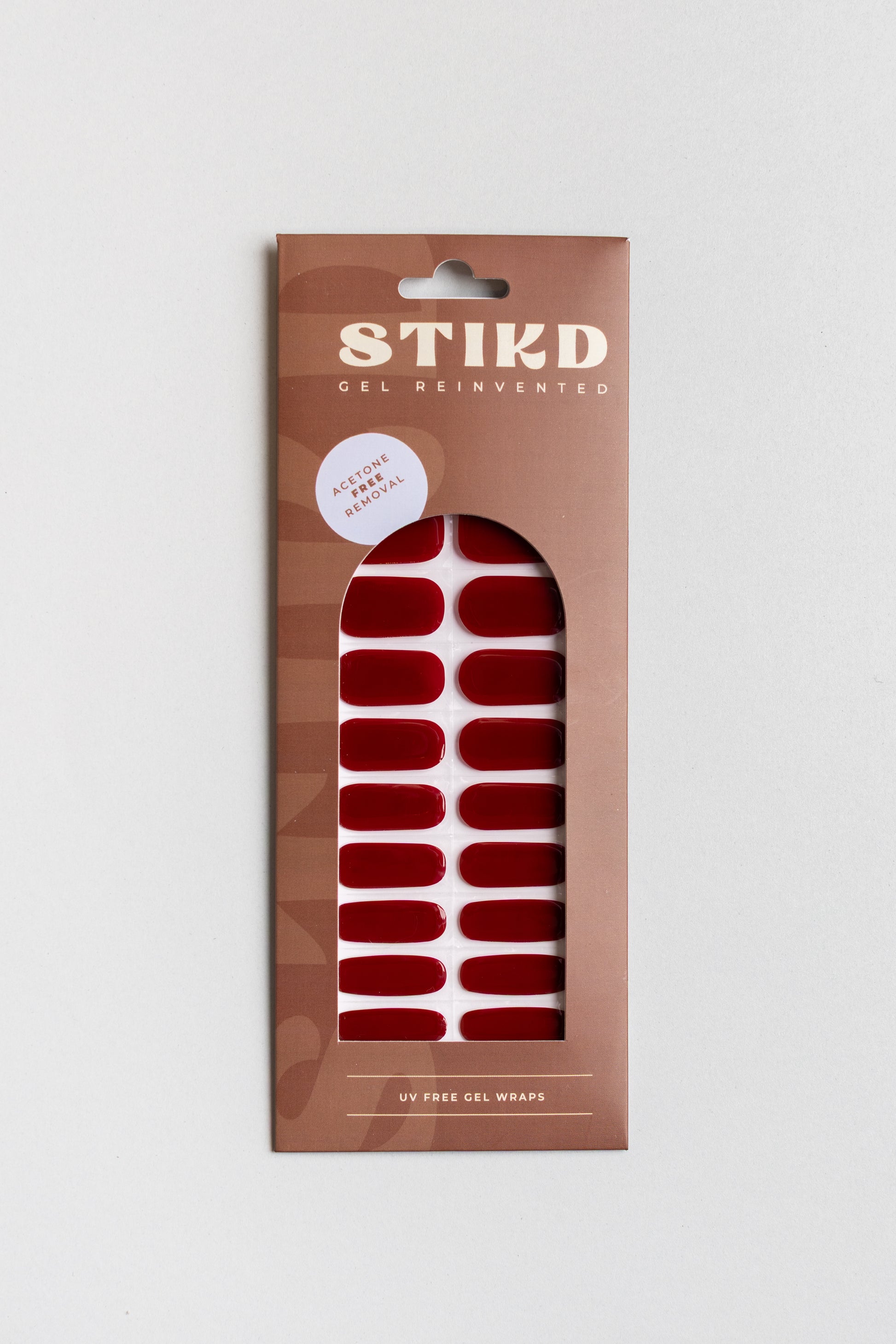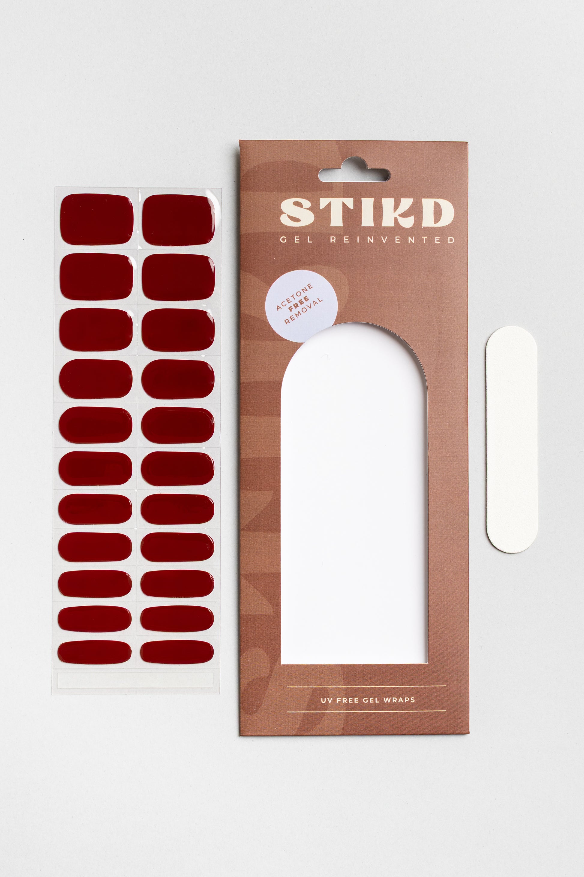 A deep wine red set of fully cured gel nails. 22 sizes to choose from. Optional, but recommended: finish off with STIKD Glow On! Quick Air-dry top coat.