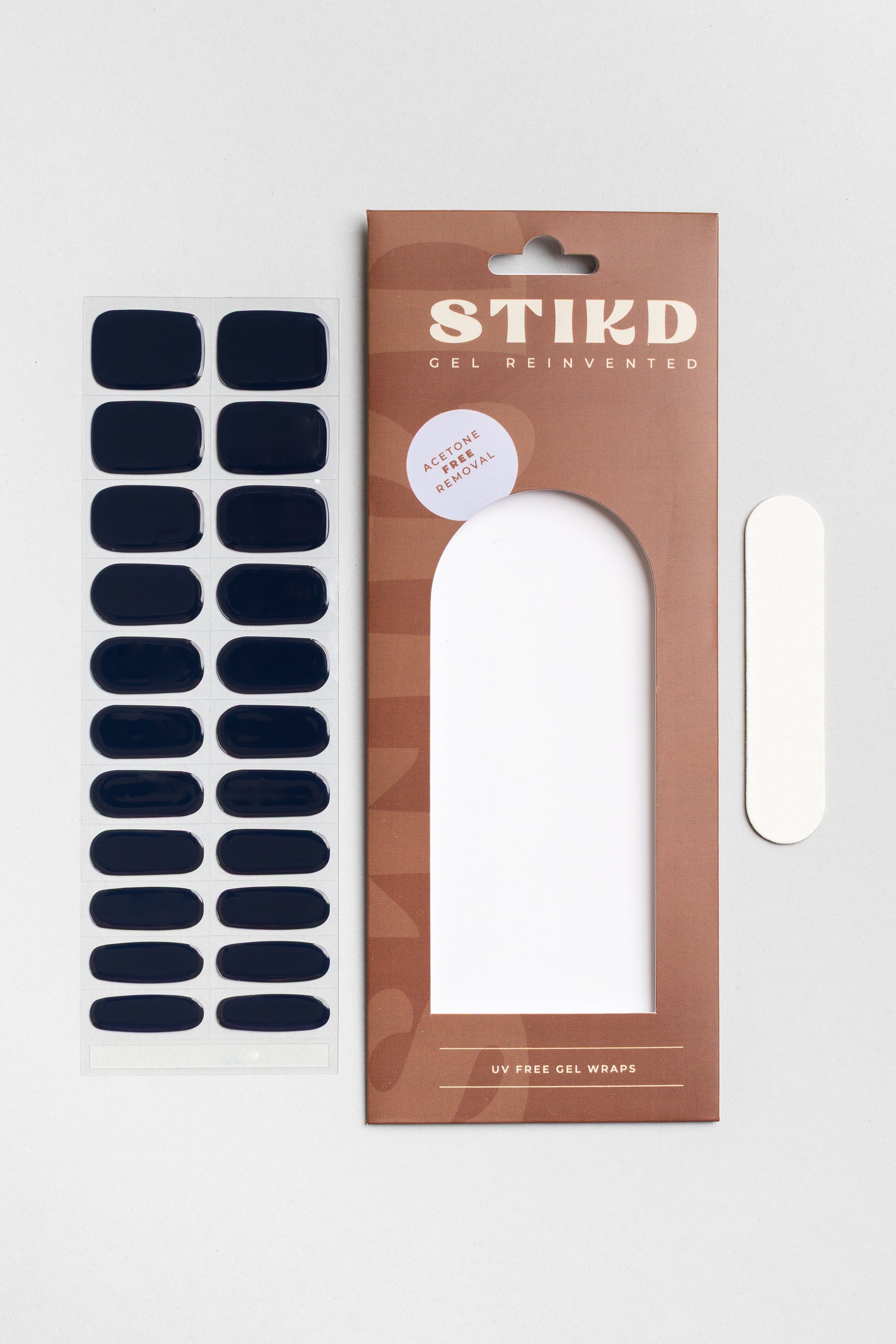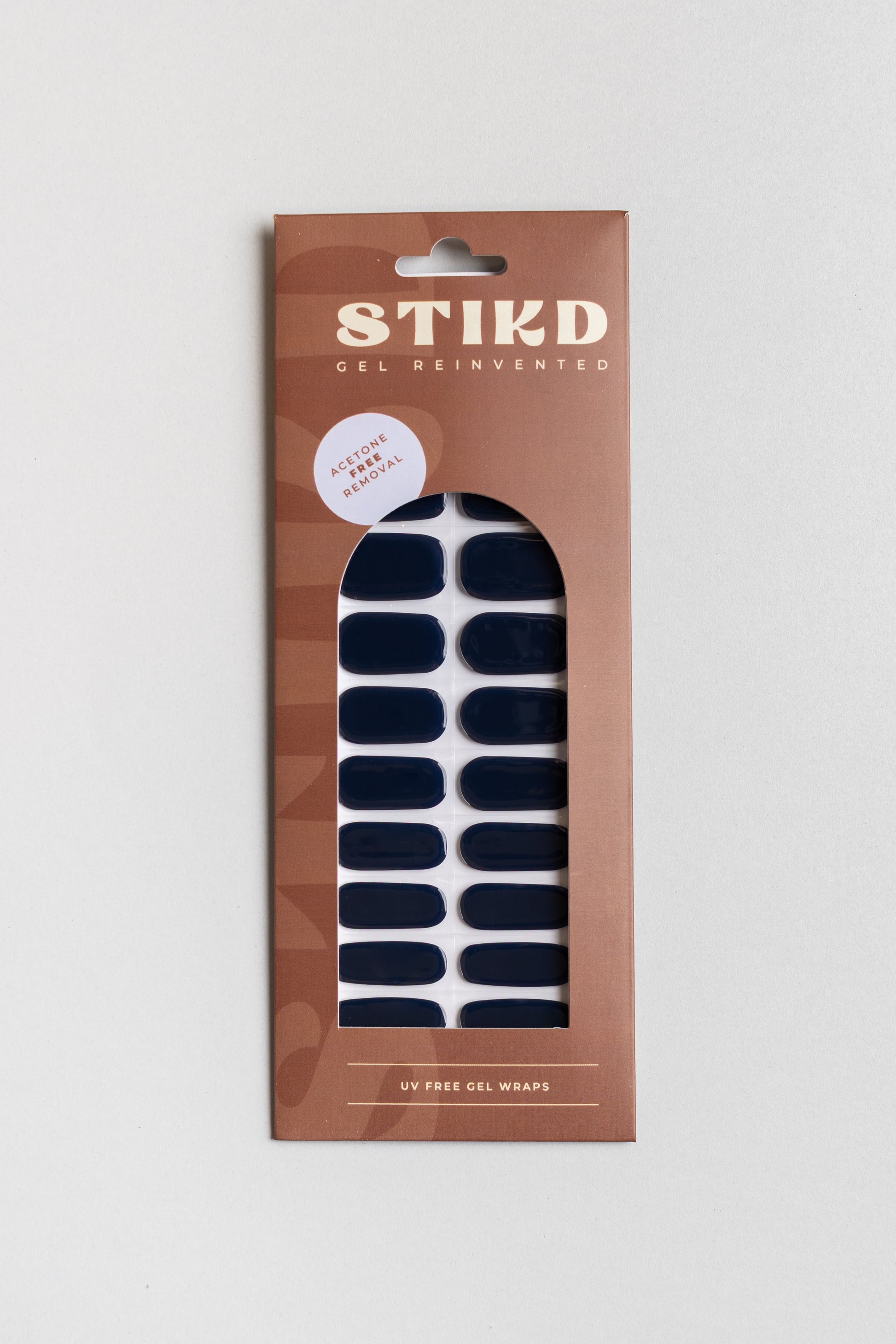 A deep navy set of fully cured gel nails. 22 sizes to choose from. Optional, but recommended: finish off with STIKD Glow On! Quick Air-dry top coat.