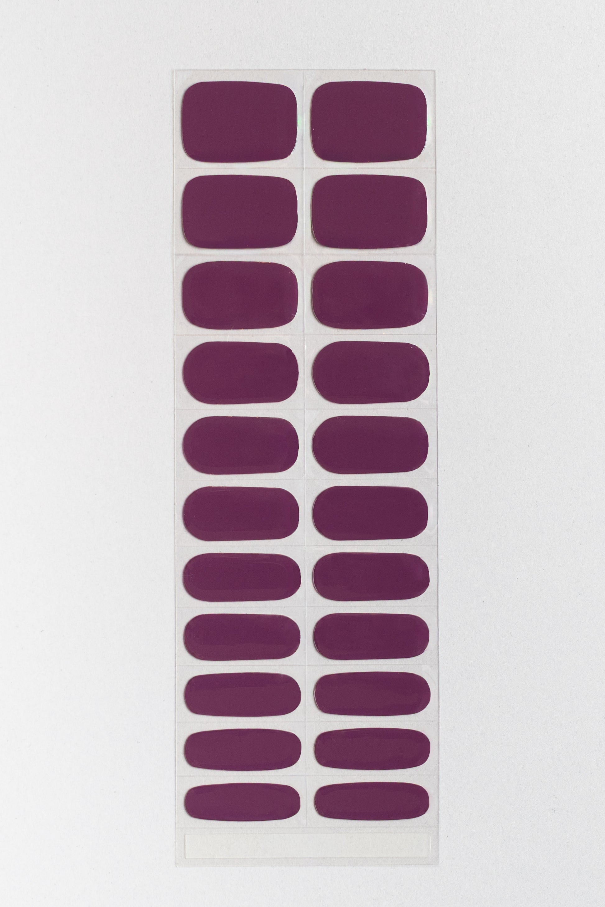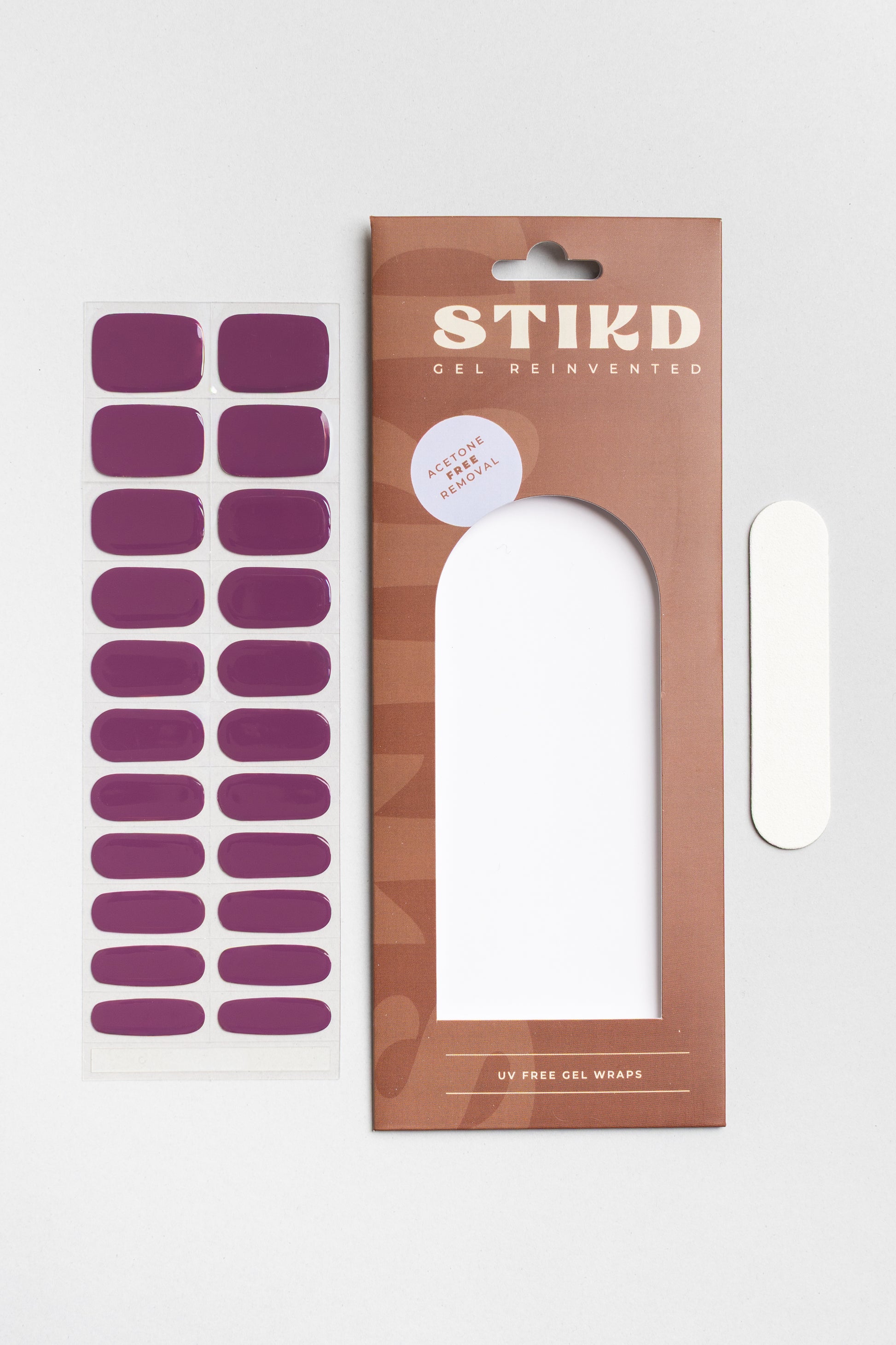 A mauve purple set of fully cured gel nails. 22 sizes to choose from. Optional, but recommended: finish off with STIKD Glow On! Quick Air-dry top coat.