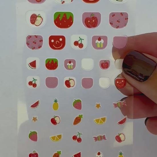 Size and press: Choose the correct size for your nail, gently peel it off and press onto your nails. If the size is too big, you can (gently) stretch the sticker out vertically to slim it in a bit, if it is too small you can stretch it horizontally to make it wider.