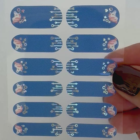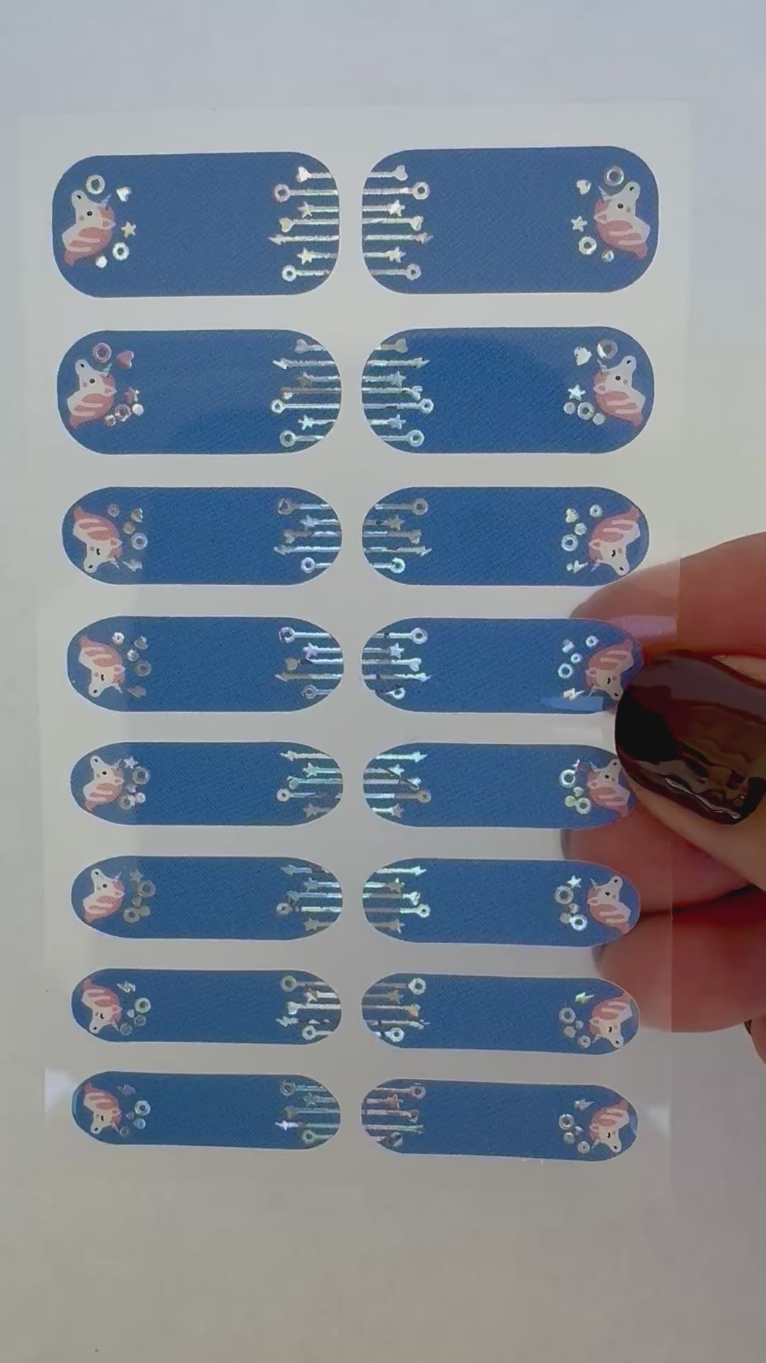 Size and press: Choose the correct size for your nail, gently peel it off and press onto your nails. If the size is too big, you can (gently) stretch the sticker out vertically to slim it in a bit, if it is too small you can stretch it horizontally to make it wider.