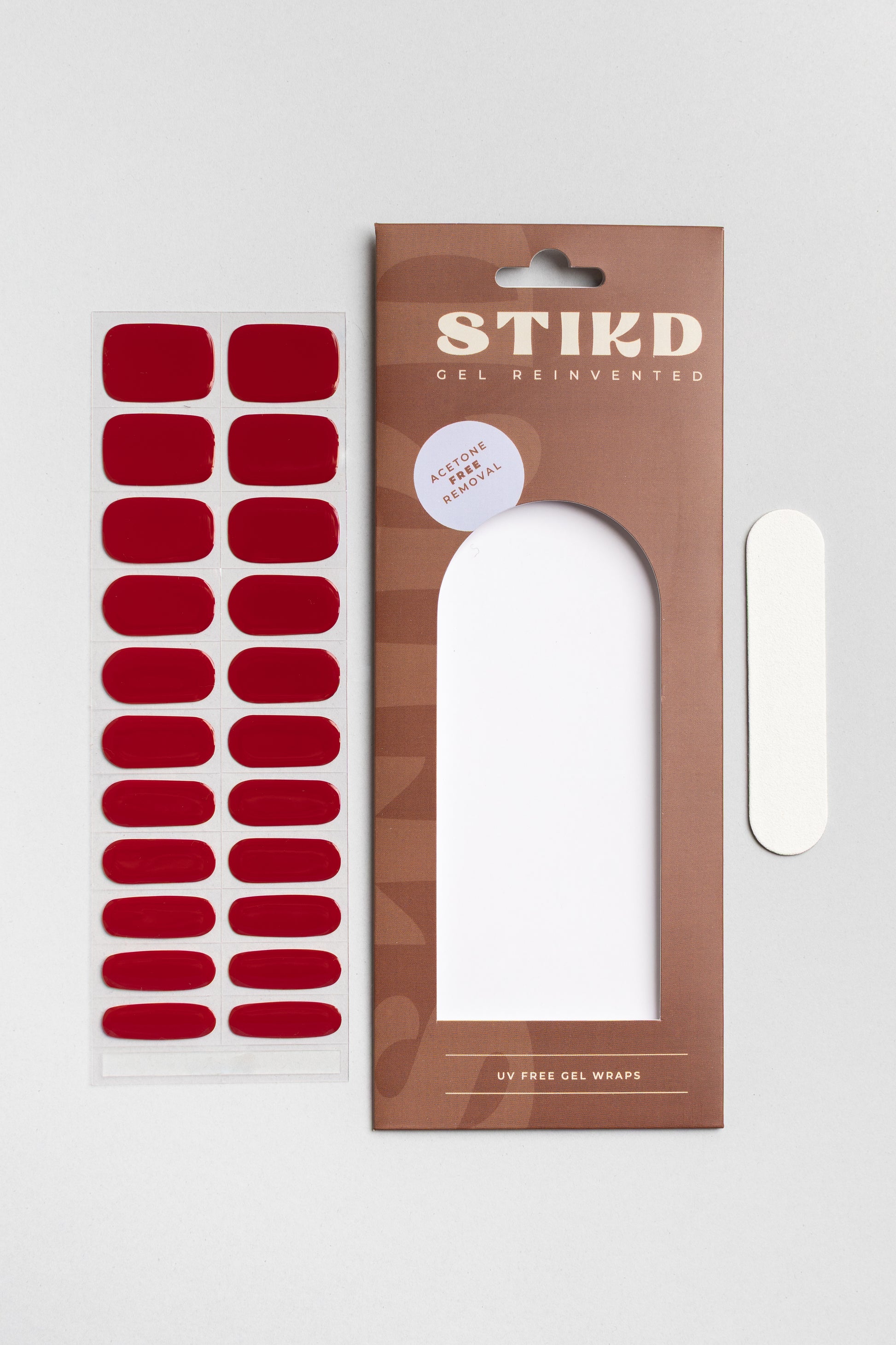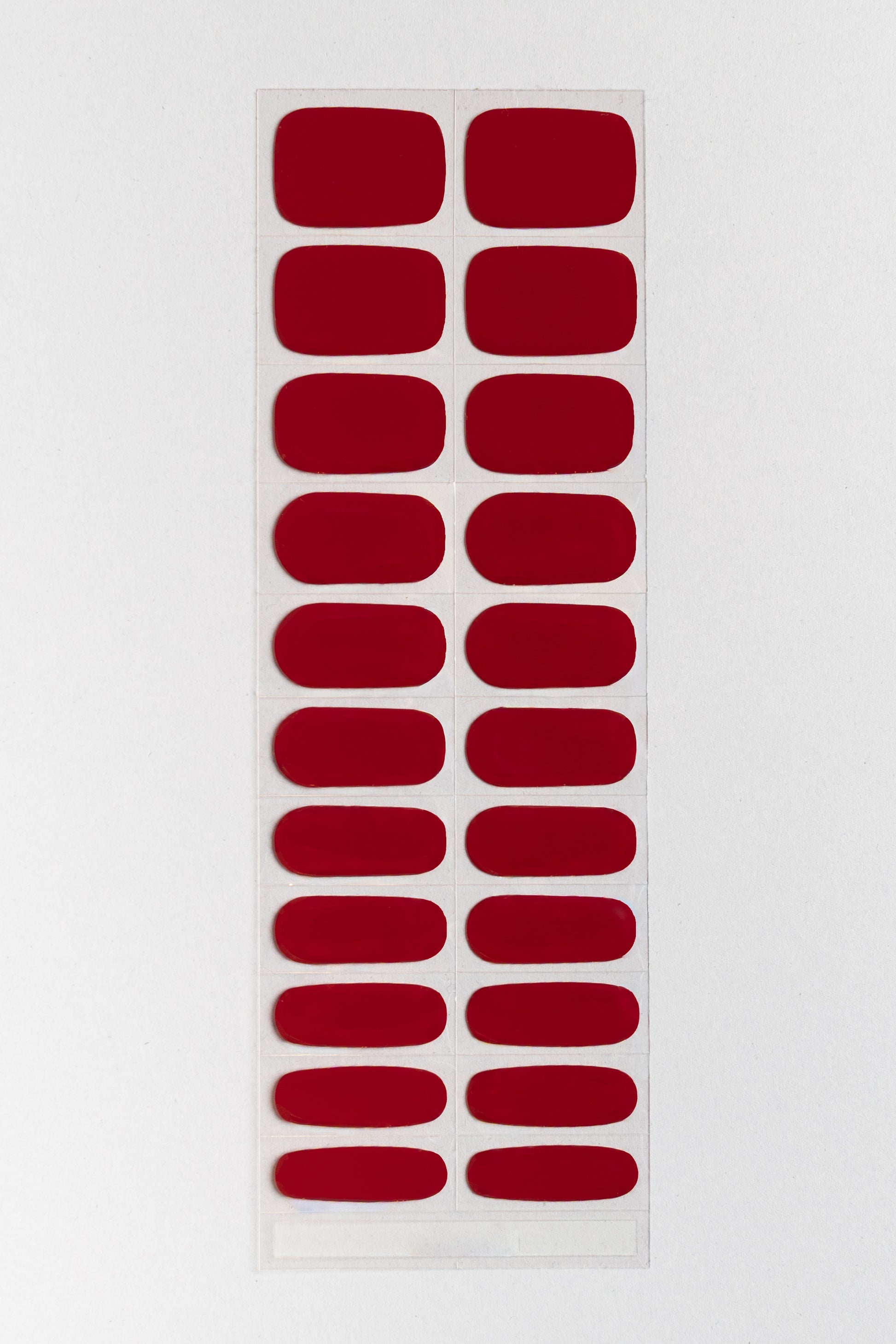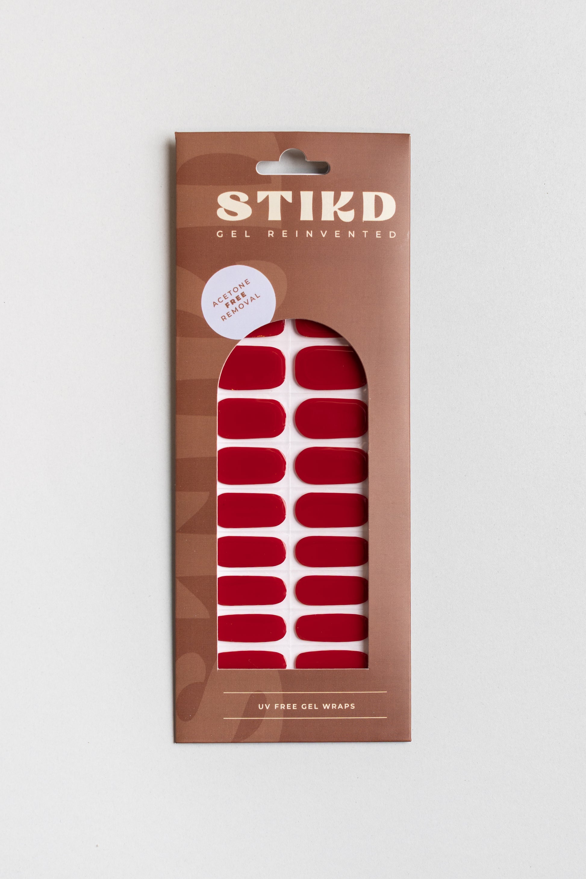 A bright red set of fully cured gel nails. 22 sizes to choose from. Optional, but recommended: finish off with STIKD Glow On! Quick Air-dry top coat.